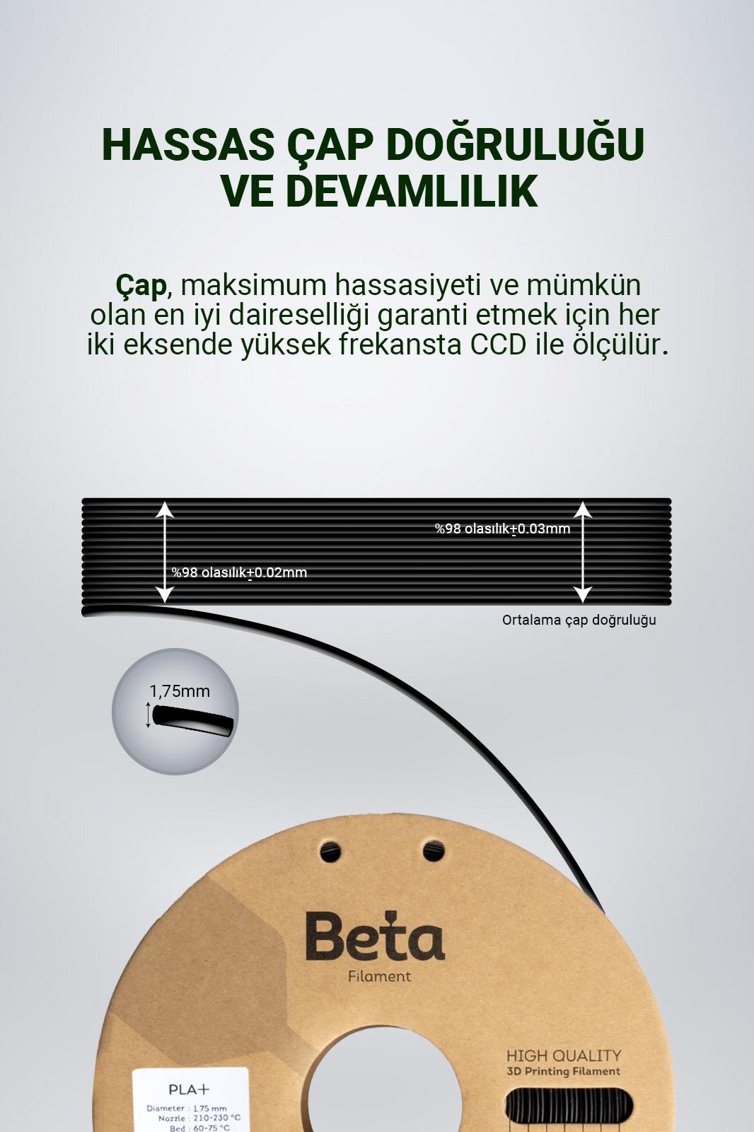 Yüksek Kalite ve Hassasiyet: Beta PLA+ filament, yüksek kaliteli malzemelerin kullanımıyla üretilmiştir. Bu, baskılarınızın ayrıntılarının net ve keskin olmasını sağlar. Filamentin homojen yapısı, baskılarınızın pürüzsüz ve düzgün bir şekilde oluşturulmasını sağlar. Bu özellik, hassas parçalar veya detaylı prototipler oluştururken önemlidir.