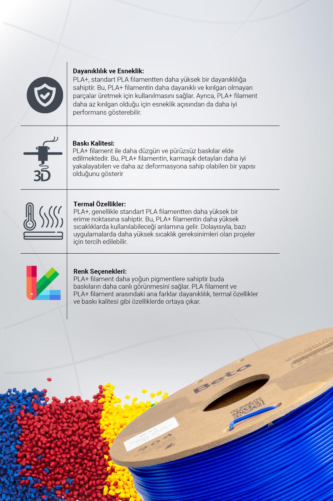 Çeşitlilik ve Canlı Renk Seçenekleri: Beta PLA+ filament, yüksek kaliteli PLA granüllerinden üretilmiştir ve canlı renk seçenekleri sunar. Bu filament, kaliteli malzemesi sayesinde baskılarınızın net ve keskin renklere sahip olmasını sağlar. Ayrıca, geniş renk yelpazesiyle kullanıcılarına zengin bir seçenek sunar. Canlı renkler, baskılarınızı daha çekici hale getirir ve yaratıcılığınızı ifade etmenize olanak tanır. Bu özellikler, Beta PLA+ filamenti 3D baskı projelerinizde tercih etmeniz için güçlü bir neden oluşturur.