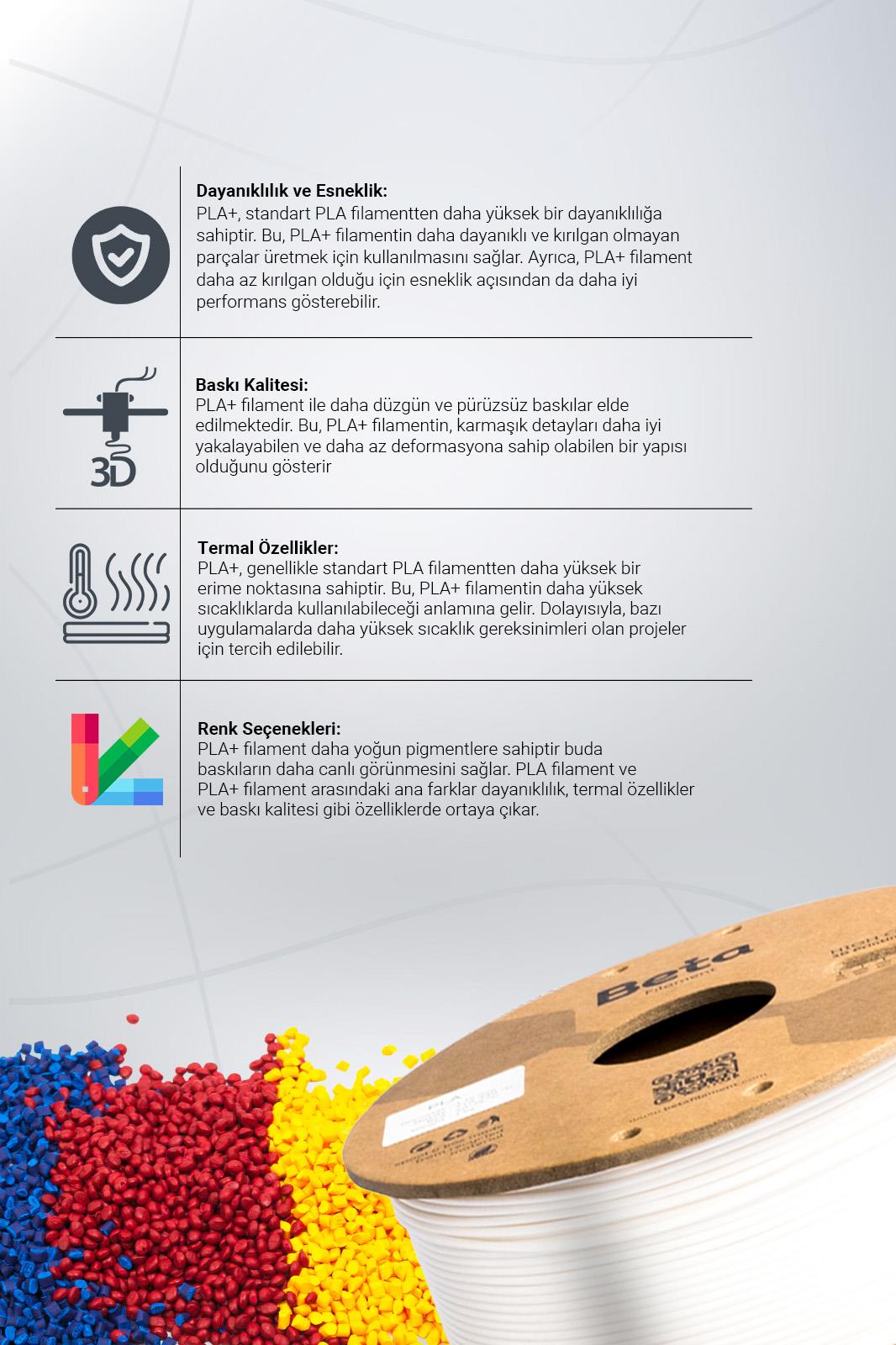 Çeşitlilik ve Canlı Renk Seçenekleri: Beta PLA+ filament, yüksek kaliteli PLA granüllerinden üretilmiştir ve canlı renk seçenekleri sunar. Bu filament, kaliteli malzemesi sayesinde baskılarınızın net ve keskin renklere sahip olmasını sağlar. Ayrıca, geniş renk yelpazesiyle kullanıcılarına zengin bir seçenek sunar. Canlı renkler, baskılarınızı daha çekici hale getirir ve yaratıcılığınızı ifade etmenize olanak tanır. Bu özellikler, Beta PLA+ filamenti 3D baskı projelerinizde tercih etmeniz için güçlü bir neden oluşturur.