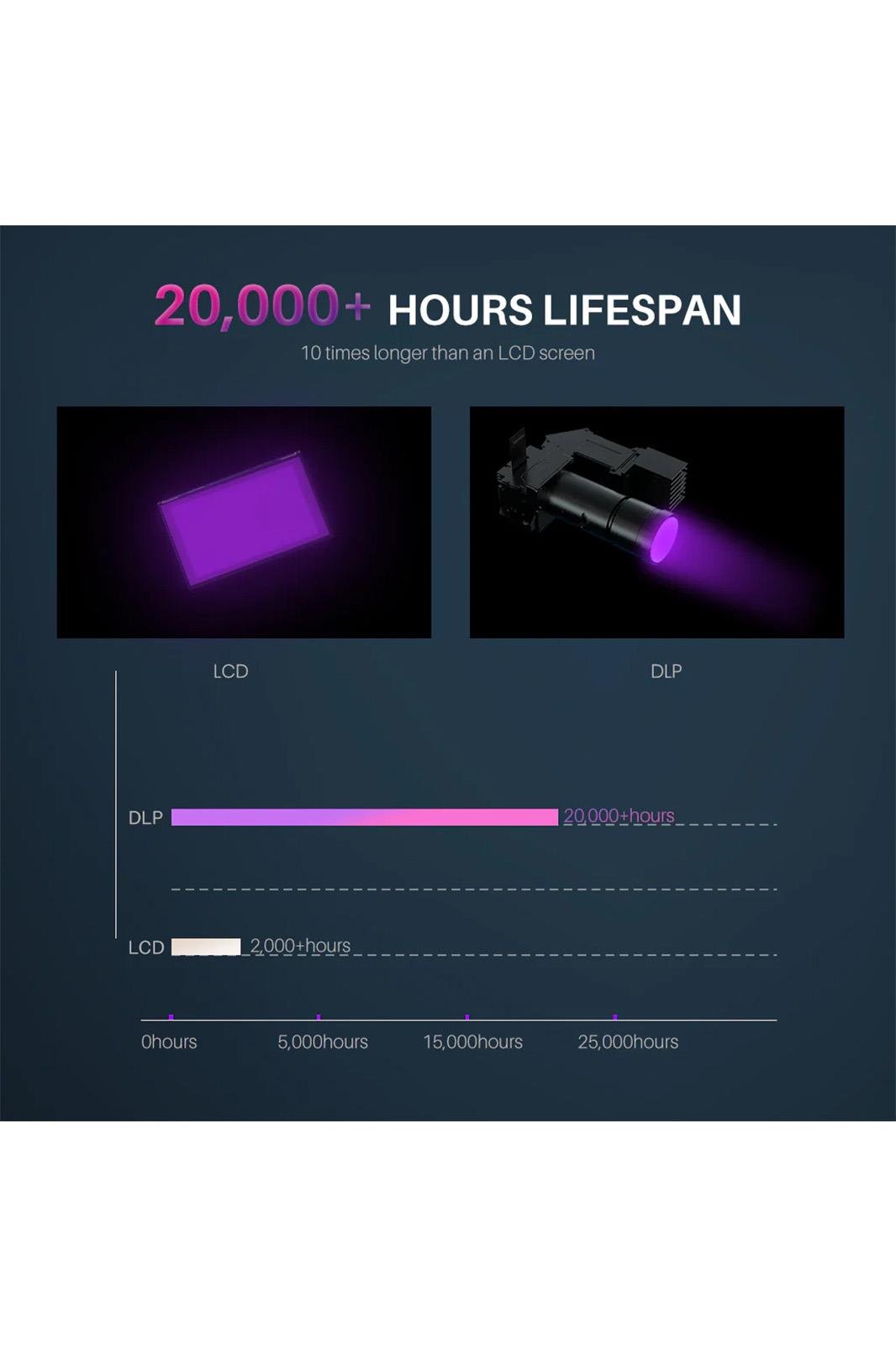 DLP projektörün hizmet ömrü, 20.000+ saat kadar uzun olup, bir LCD ekranın 2.000 saatlik ömründen 10 kat daha uzundur; bu, LCD yazıcınızın ekranını değiştirmek için çok fazla bakım maliyetinden tasarruf edeceğiniz anlamına gelir.