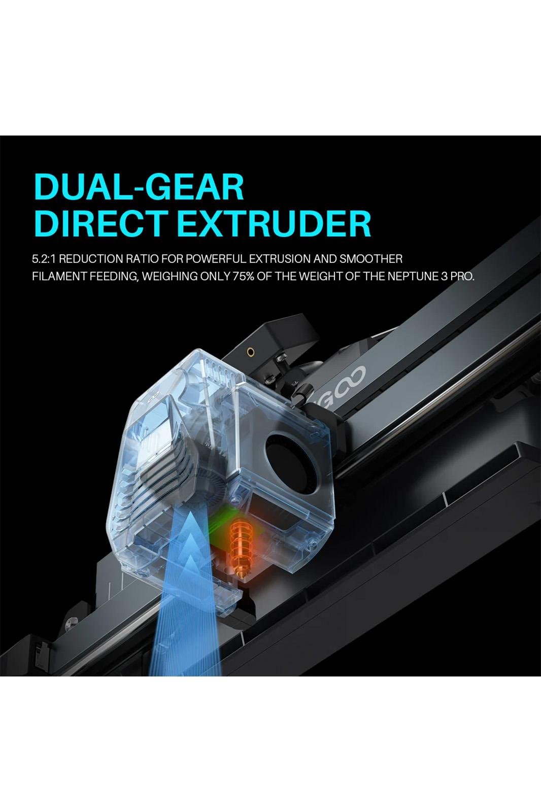 ♦ Çift Dişli Doğrudan Ekstruder: 5.2:1 küçültme oranına sahip, kendi geliştirdiği yeni çift dişli doğrudan tahrikli ekstrüder, güçlü ekstrüzyon ve daha düzgün filament besleme sağlar. Boğaz borusunun ısı dağılımını etkili bir şekilde iyileştirmek ve meme tıkanma riskini azaltmak için bakır-titanyum tamamen metal boğaz borusu ve benzersiz hava kanalı tasarımı ile eşleştirilmiştir.