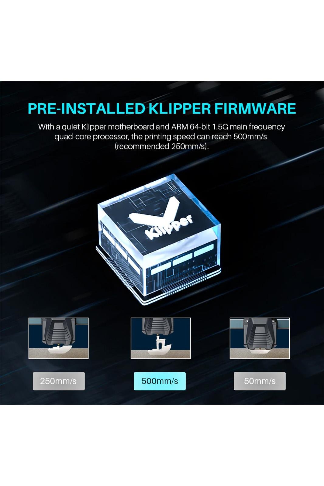 Komutları daha hızlı işlemek ve yürütmek için Klipper anakart ve ARM 64-bit 1.5G ana frekans dört çekirdekli işlemci ile Neptune 4 Pro, 500 mm/sn'ye kadar baskı yapabilir ve baskı projelerinizi hızlı ve verimli bir şekilde tamamlamanıza olanak tanır. Önceden yüklenmiş Klipper üretici yazılımımızla, ürün yazılımı yükleme zahmetine girmeden hemen yazdırmaya başlayabilirsiniz.