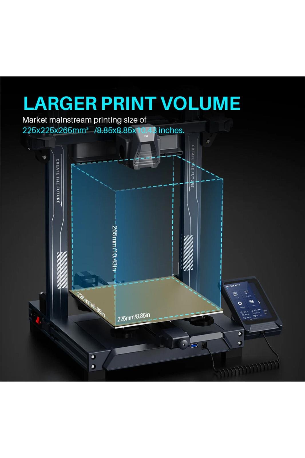 * 300°C Yüksek Sıcaklık Nozulu: 300°C'ye ulaşan yüksek sıcaklık nozulu ile yazıcı, PLA, PETG, ABS, TPU ve naylon gibi yüksek sıcaklık filamentleri dahil olmak üzere çok çeşitli filamentleri işleyebilir. Genişletilmiş sıcak uç tasarımı, tutarlı ısıtma ve daha hızlı erime ve ekstrüzyon sağlayarak daha yüksek baskı hızı sağlar.