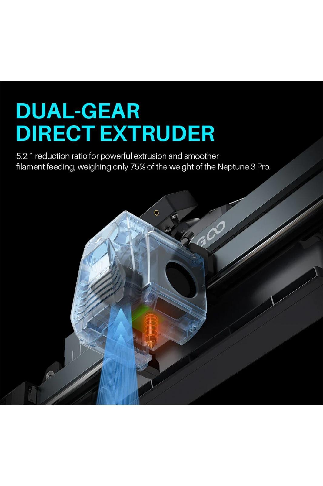 Yazıcının çift dişli doğrudan tahrikli ekstrüderi, Neptune 3 Pro'nun ağırlığının yalnızca %75'i kadar hafif ve düzgün ve tutarlı ekstrüzyon sağlayan başka bir önemli özelliktir. 5,2:1 küçültme oranı ve çift dişli tasarımı, filamanın sağlam bir şekilde kavranmasını sağlar ve esnek filamanın kaymasını ve taşlanmasını önler. Bakır-titanyum bi-metal boğaz borusu, boğaz borusunda daha hızlı ısı dağılımı ve daha az meme tıkanması için benzersiz bir hava kanalı tasarımına sahiptir.