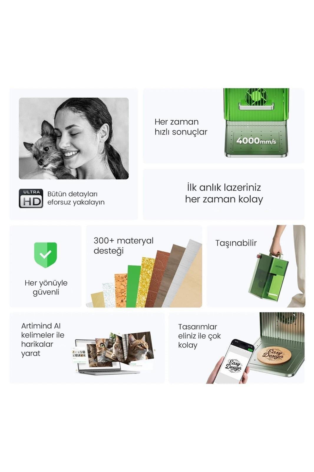 xTool F1, 2W 1064 nm kızılötesi lazer ile 10W 455 nm diyot lazeri birleştiren dünyanın ilk lazer kazıyıcısıdır. Makine önceden montelenmiştir ve kullanımı son derece kolaydır. İşlemesi kolay ancak güçlü bir fonksiyonelliğe sahiptir.