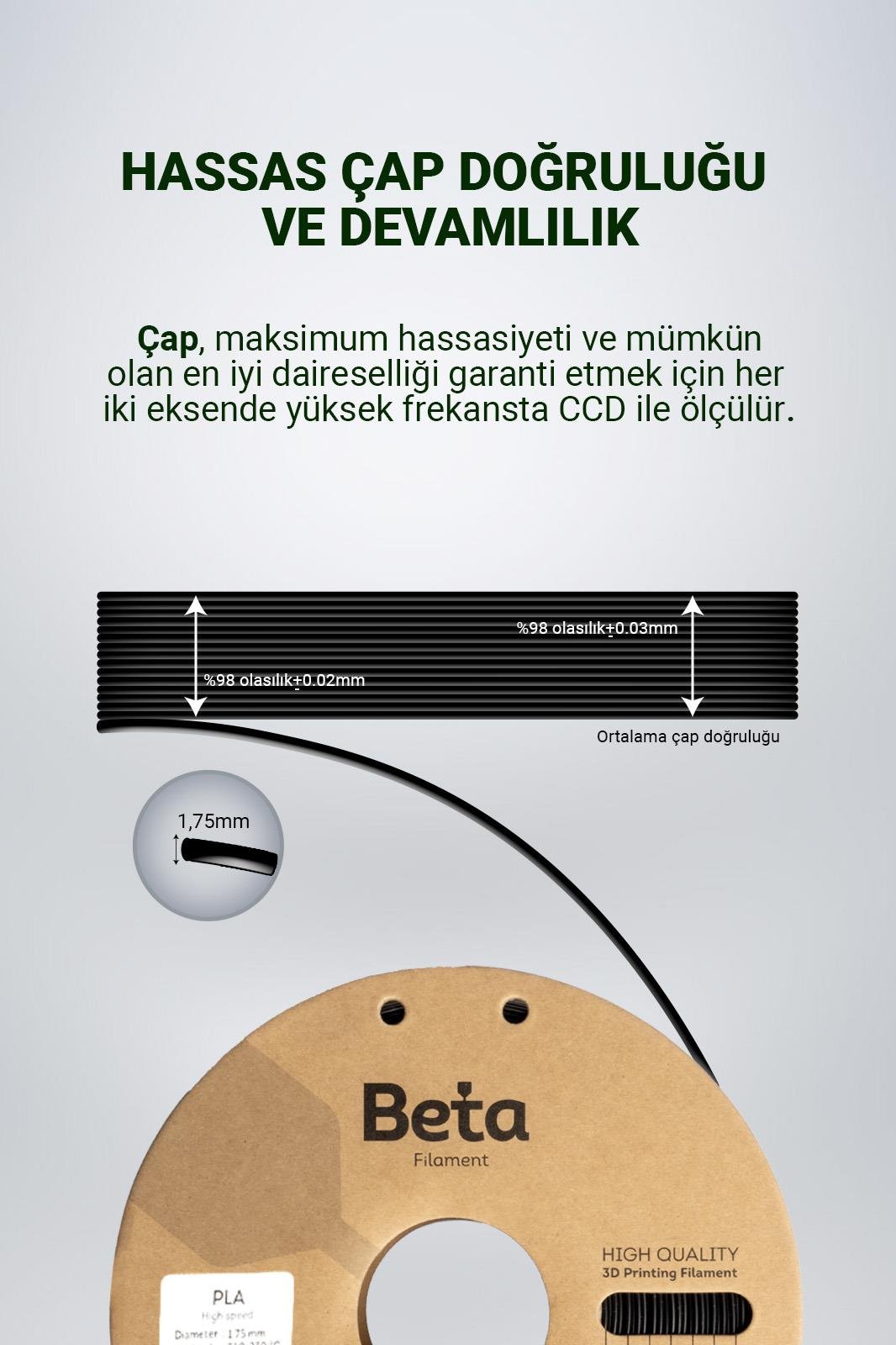 Beta PLA High-Speed yüksek akışkanlı filamentler, yüksek kaliteli malzemelerden üretilir ve baskılarınızın dayanıklılığını artırmak için özel olarak formüle edilir. Sonuç olarak, baskılarınız uzun süre dayanıklılığını korur ve zamanla renklerini veya yapılarını kaybetmezler. Bu özellik, fonksiyonel parçaların, prototiplerin veya endüstriyel uygulamaların üretilmesi için idealdir.