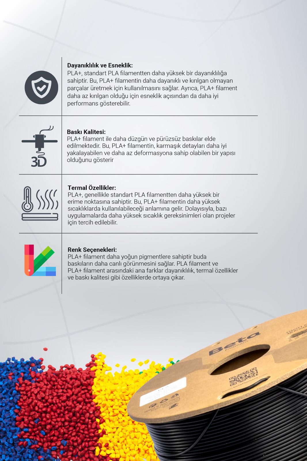 Beta PLA High-Speed yüksek akışkanlı filamentler, yüksek kaliteli PLA granüllerinden üretilmiştir ve canlı renk seçenekleri sunar. Bu filament, kaliteli malzemesi sayesinde baskılarınızın net ve keskin renklere sahip olmasını sağlar. Ayrıca, geniş renk yelpazesiyle kullanıcılarına zengin bir seçenek sunar. Canlı renkler, baskılarınızı daha çekici hale getirir ve yaratıcılığınızı ifade etmenize olanak tanır. Bu özellikler, Beta PLA High-Speed yüksek akışkanlı filamentleri, 3D baskı projelerinizde tercih etmeniz için güçlü bir neden oluşturur.