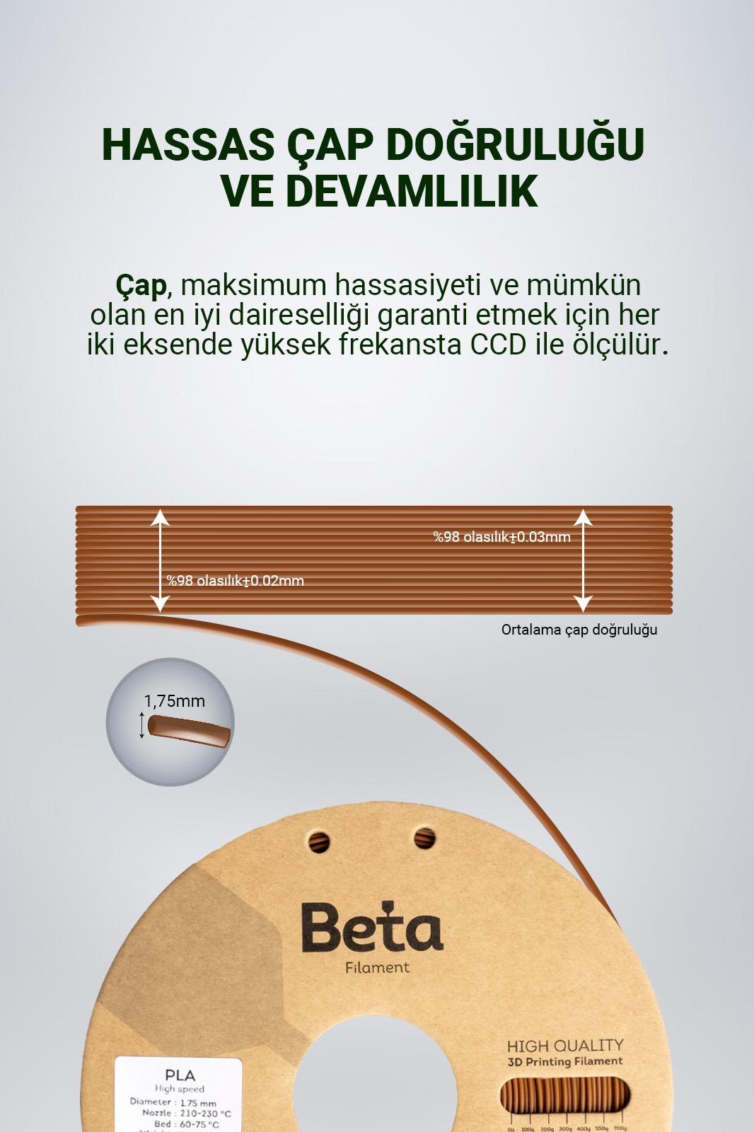 Beta PLA High-Speed yüksek akışkanlı filamentler, düşük viskoziteli özel bir formülasyona sahiptir. Bu özellik, filamentin 3D yazıcı nozulundan kolayca akmasını sağlar, böylece daha hızlı baskılar yapılabilir ve daha ince detaylar elde edilebilir. Aynı zamanda, malzemenin işlenebilirliği yüksektir, bu da son katmana kadar ürününüzde daha pürüzsüz ve homojen bir yüzey elde etmenize yardımcı olur.