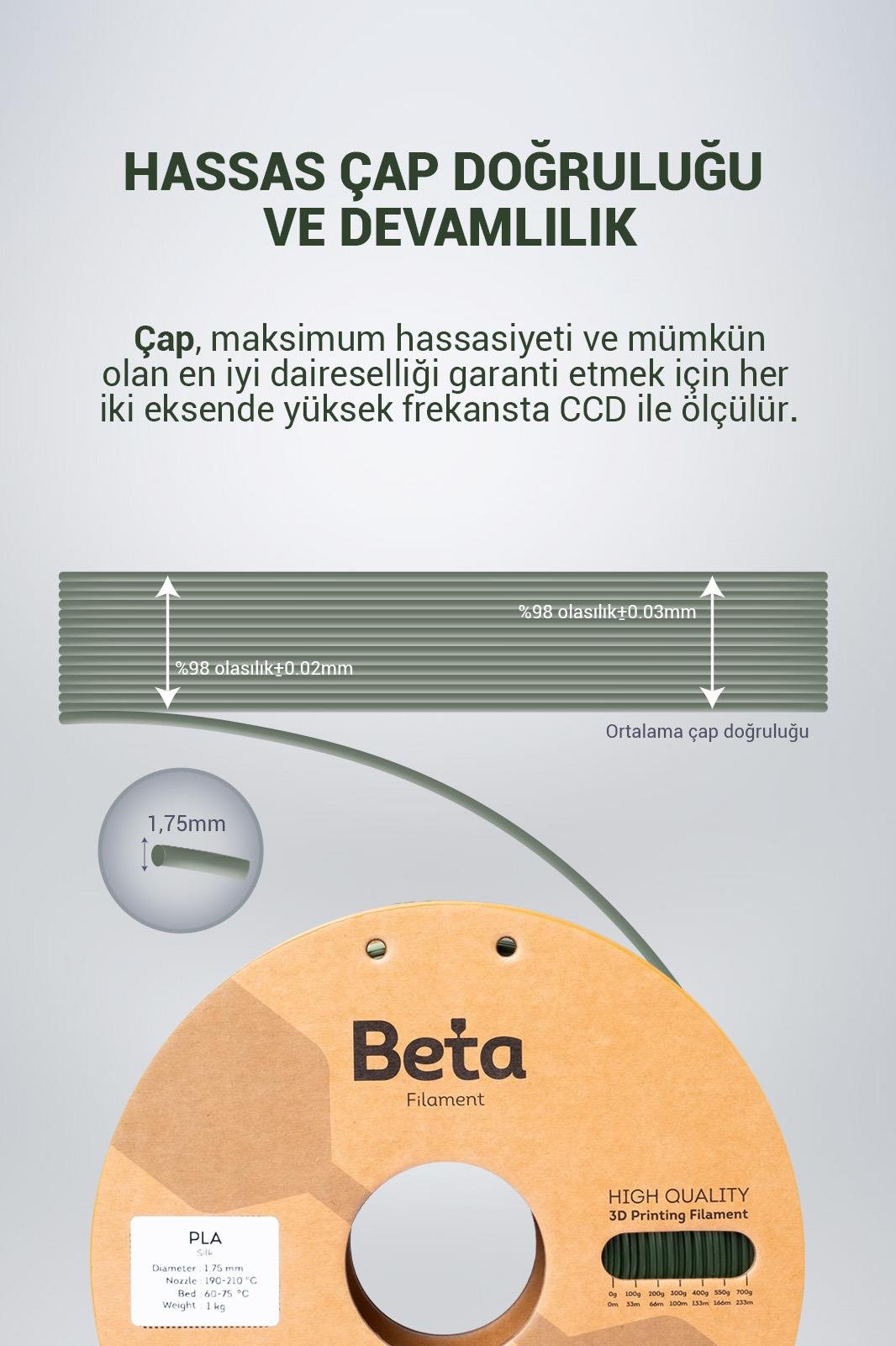 Mükemmel Boyut Toleransı: Beta PLA Silk filamentler, +/- 0,02 mm gibi son derece hassas bir toleransı garanti eden titiz standartlara göre üretilmiştir. Mükemmel yuvarlak şekli ve sıkı çap toleransı sayesinde minimum eğilme, koku, tıkanma veya kabarcık olmadan sorunsuz bir baskı deneyimi yaşarsınız.