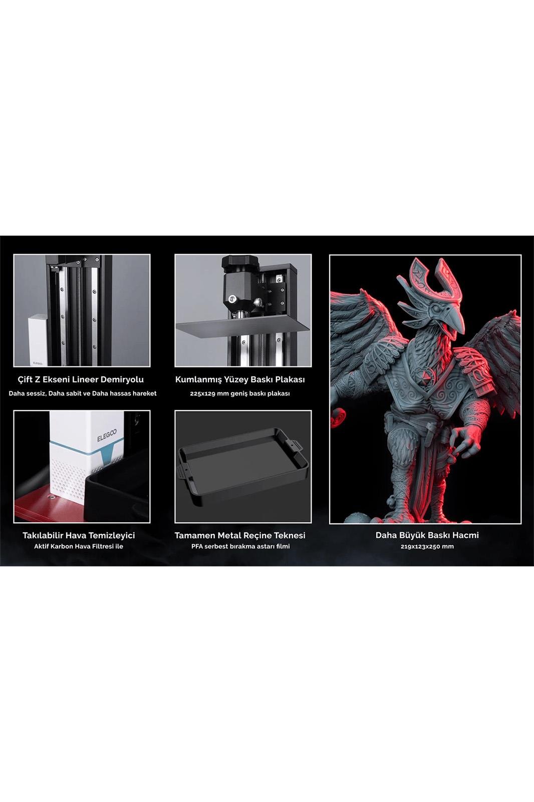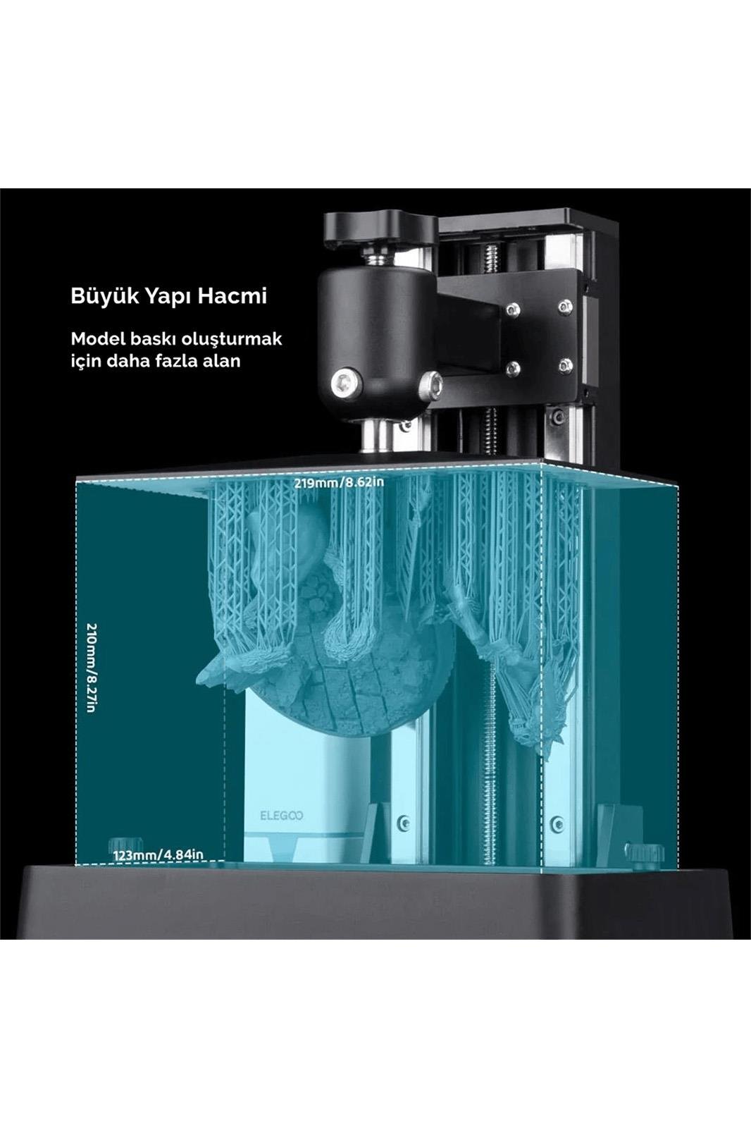Satürn'ün Baskı Hacminden %43 Daha Büyük: 219x123x250mm / 8,62x4,84x9,84 inçlik bir yapı hacmi ve 10” geniş tek renkli LCD ekran, prototip boyutunu büyütür ve sertleştirme verimliliğini yükseltir, daha büyük bir modeli veya birden çok modeli yazdırabilirsiniz tek partide daha küçük modeller.