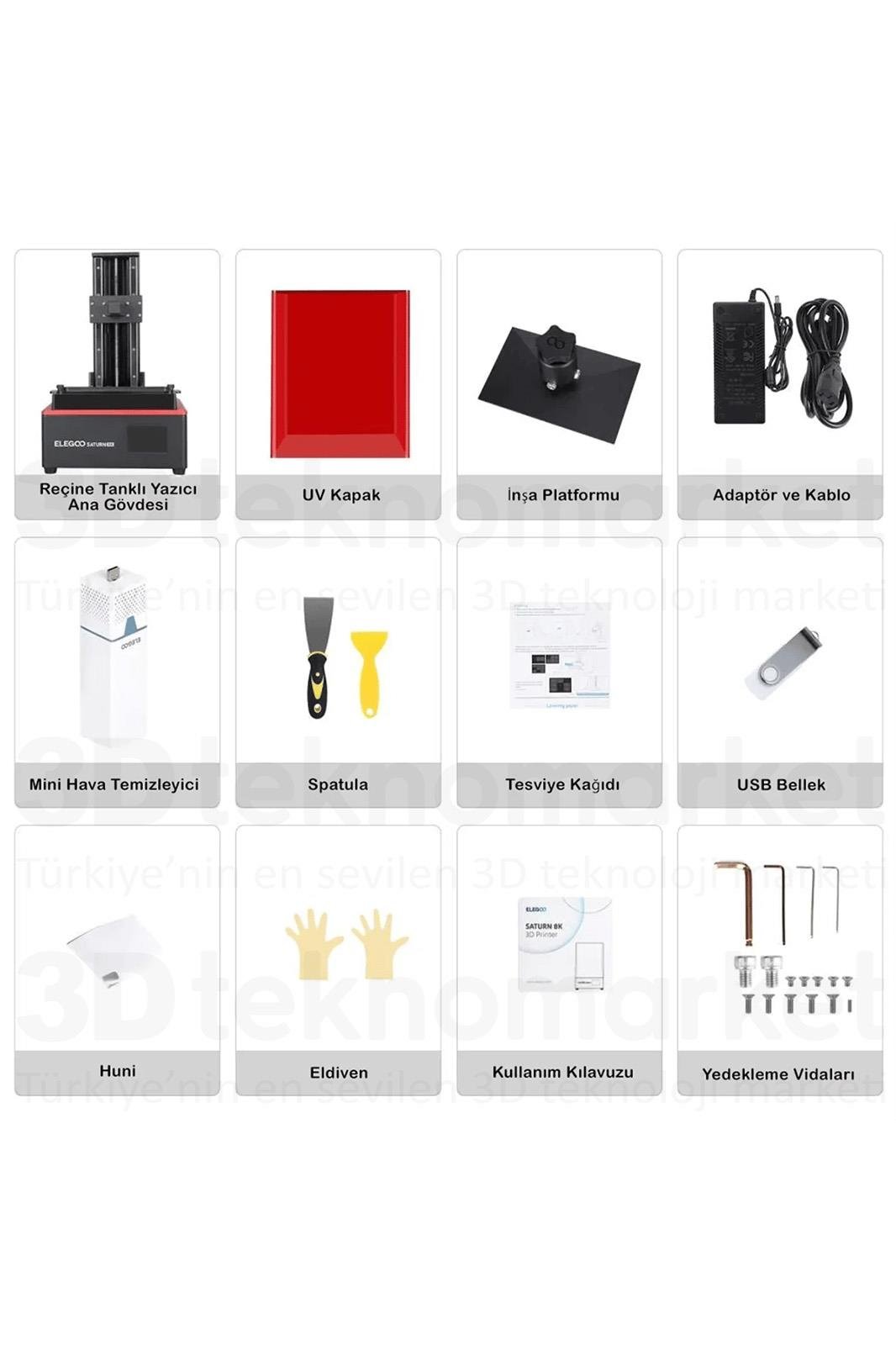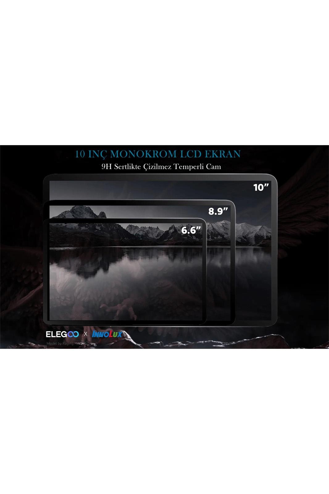 10" 8K Monokrom LCD: ELEGOO Saturn 2,7680x4320 HD çözünürlüğe ve 28,5 mikronluk ultra ince XY çözünürlüğe sahip 10 inç 8K mono LCD ekrana sahiptir ve yalnızca 1-3 saniyelik kürlenme süresiyle olağanüstü ayrıntılı 3D modeller üretir Daha iyi ışık iletimi ve koruması için LCD ekranın üzerinde 9H sertliğe sahip çizilmeye dayanıklı temperli cam.