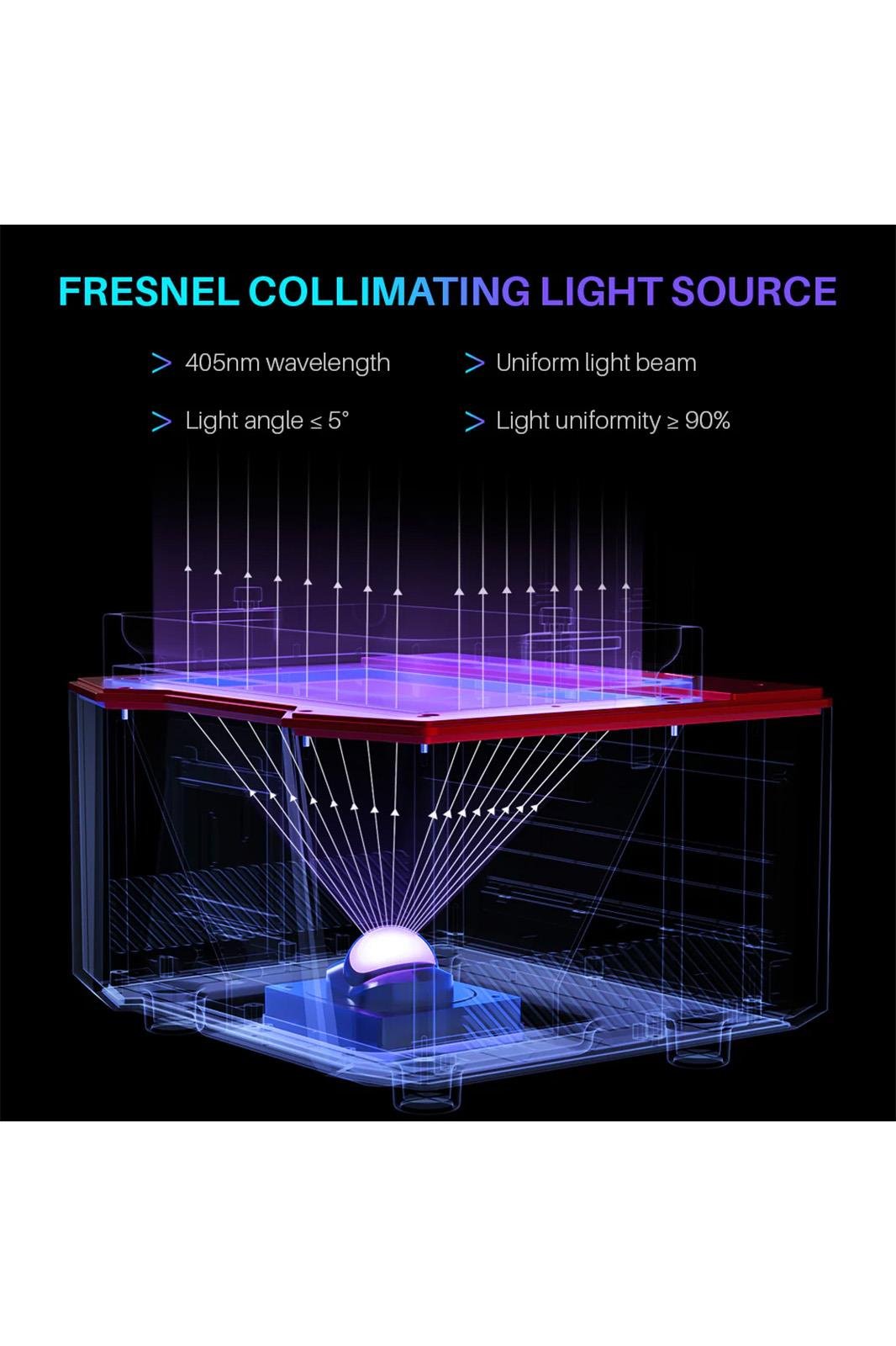 Fresnel Yönlendiren Işık Kaynağı: COB ışık kaynağı ve Fresnel yönlendiren lens, 405nm dalga boyunda düzgün bir ışık demeti yaymak için birlikte çalışır ve ışık açısının 5°'ye ulaşmasını, ışık homojenliğinin %90'ın üzerinde olmasını ve ışık saçılma katsayısının içinde olmasını sağlar. %0,5 Bu, olağanüstü netlik ve ayrıntıya sahip son derece doğru ve tutarlı baskılarla sonuçlanır.