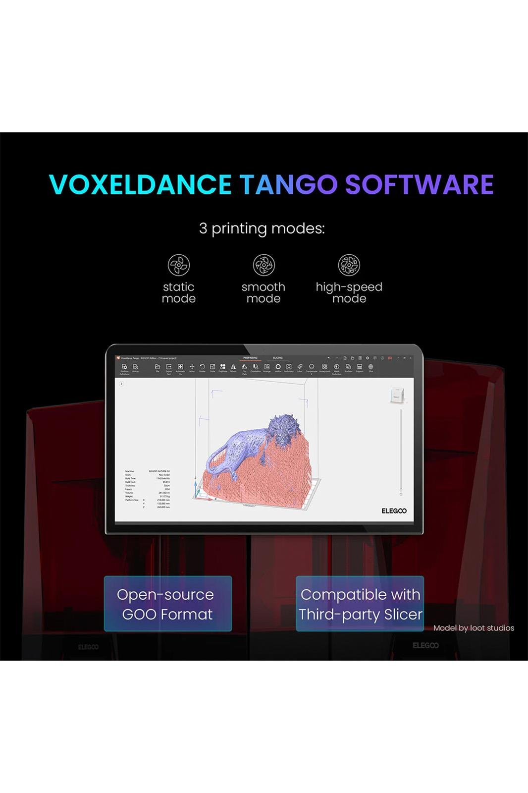 Voxeldance Tango Yazılımı: 3 baskı modu sunar: baskı verimliliğini artırmak için statik mod ve dinamik mod (yumuşak mod ve yüksek hızlı mod dahil). Açık kaynaklı GOO dilim dosya formatı, CHITUBOX ve Lychee Slicer gibi üçüncü taraf dilim yazılımlarıyla uyumludur.