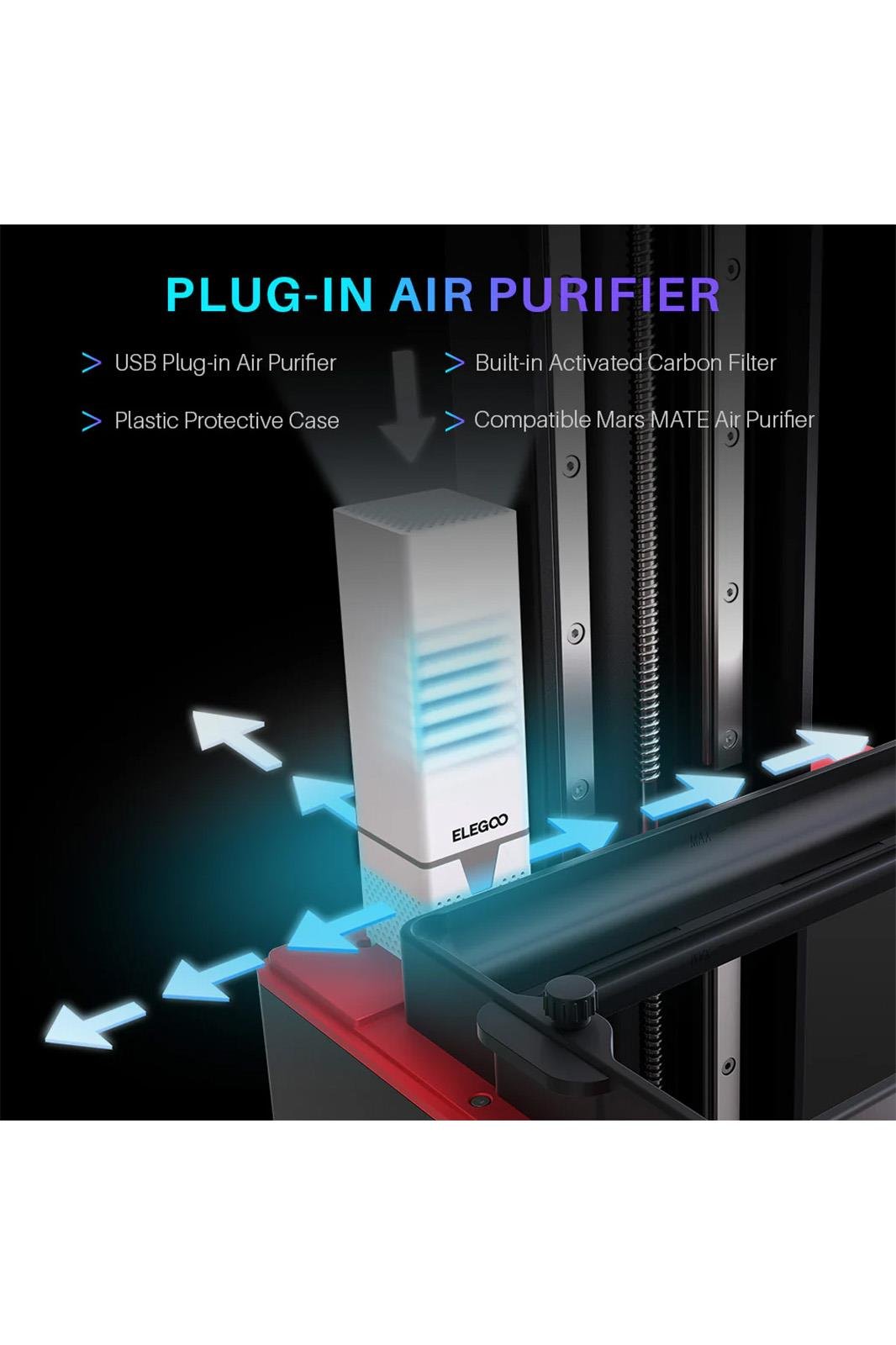 Plug-in Air Purifier: Yerleşik aktif karbon filtreli ve plastik koruyucu kılıflı yükseltilmiş USB takılabilir hava temizleyici, baskı sırasında zararlı kokuların temizlenmesini sağlar. Ayrıca, daha güvenli bir çalışma ortamı için VOC'leri %95'e kadar giderebilen yakında çıkacak olan ELEGOO Mars MATE hava temizleyicisini seçebilirsiniz.